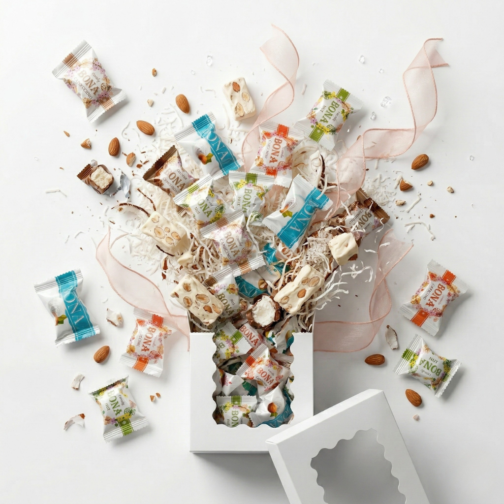 A refined 500 g chocolate assortment featuring four Bonna varieties coated in delicate coconut flakes. These candies are inspired by the light texture and tropical profile of coconut-based pralines, offering a soft cream center and a smooth outer coating.